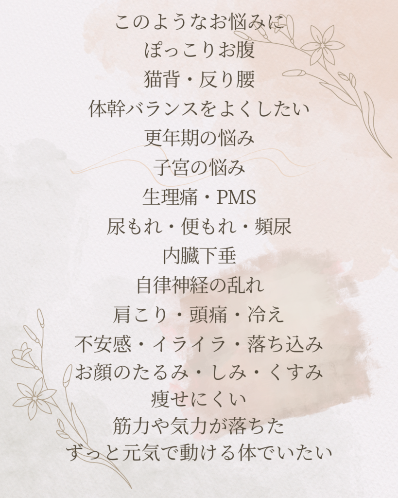 女性の体は様々な変化があり、人になかなか話せない悩みもあります。尿漏れ、便漏れ、トイレが我慢できない、内臓下垂、更年期、生理痛、便秘、ぽっこりお腹、太りやすくなった、シミが増えた、筋力が落ちた、猫背、肩こり、腰痛、自律神経、気力がない、食いしばりなどのお悩みを解決してより良い人生にしませんか?